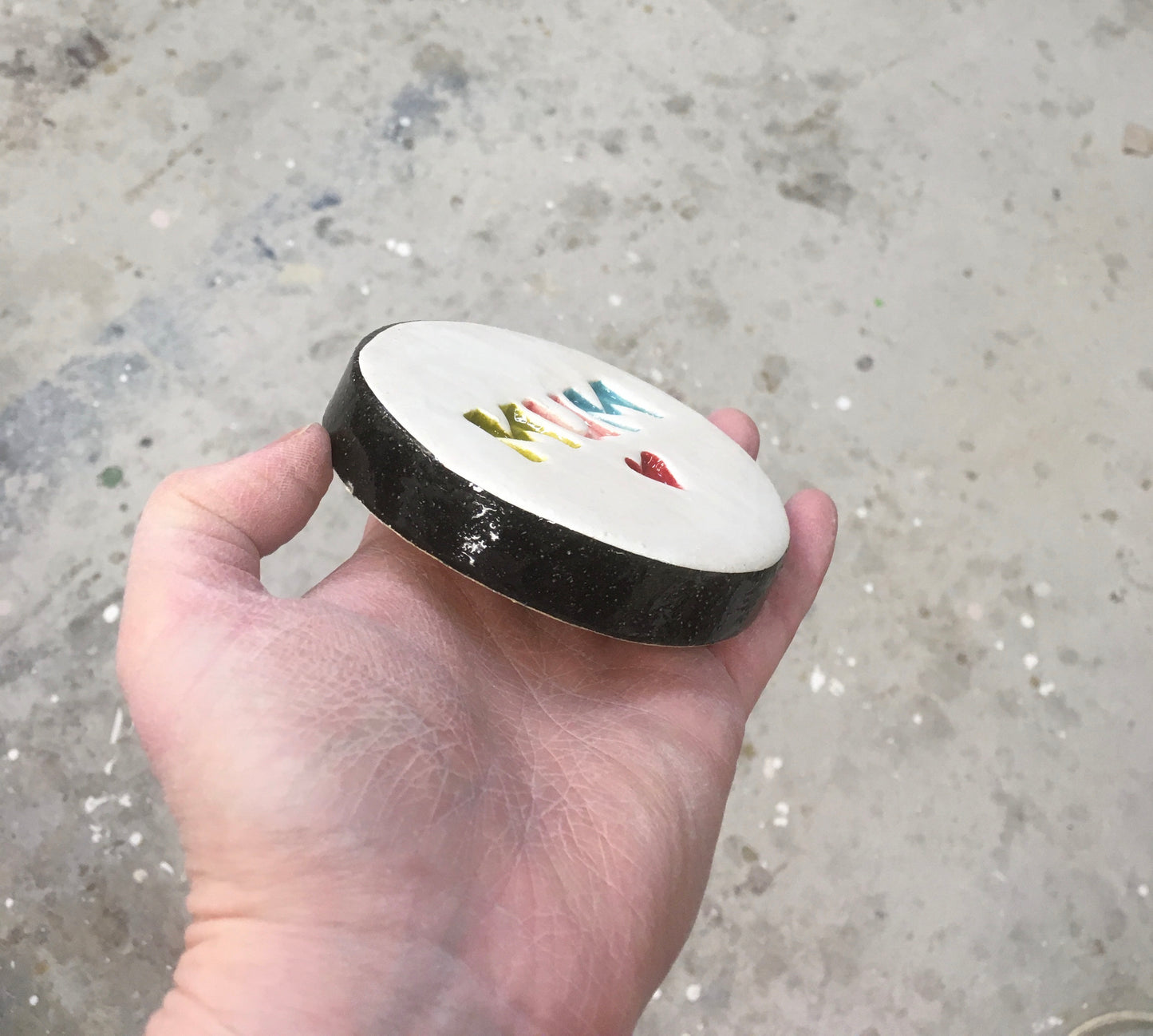 A circular tile is glazed in a soft white and stamped with our handmade alphabet spelling 'Mum ' finished with a contemporary palette and bordered with a black edge .